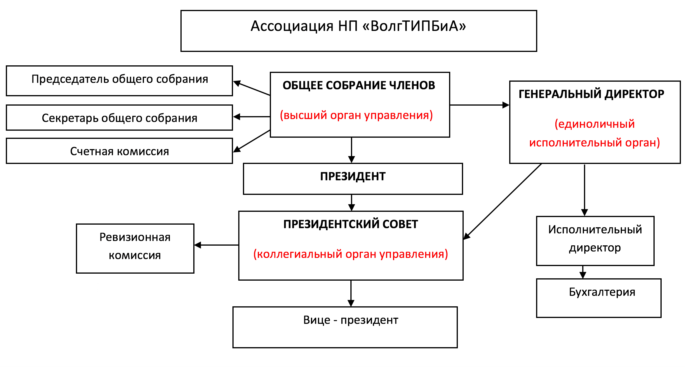 Общее собрание выбирает сроком на пять лет Президента Волг ТИПБиА (Председателя собрания) и Президентский Совет Волг ТИПБиА. Президент Волг ТИПБиА в силу своей компетенции: - руководит работой Общего собрания и Президентским Советом Волг ТИПБиА; - созывает очередные и внеочередные Общие собрания, заседания Президентского Совета Волг ТИПБиА; - подписывает протоколы заседаний Общего собрания и Президентского Совета Волг ТИПБиА; - организует контроль за выполнением решений Общего собрания и Президентского Совета Волг ТИПБиА; - представляет и защищает интересы Волг ТИПБиА в отношениях с третьими лицами и государственными органами, а также в средствах массовой информации; - подписывает документы, подтверждающие членство в Волг ТИПБиА; - заключает и расторгает трудовой договор с Генеральным директором Волг ТИПБиА в соответствии с Трудовым кодексом Российской Федерации;- без доверенности действует от имени Волг ТИПБиА по вопросам представления его интересов в отношениях с организациями, заключает договоры, в том числе трудовые, выдает доверенности, открывает счета в кредитных организациях, пользуется правом распоряжения средствами в соответствии с утвержденной сметой доходов и расходов Волг ТИПБиА, в пределах своих полномочий совершает всякого рода сделки и иные юридические акты, связанные с уставной деятельностью Волг ТИПБиА.
